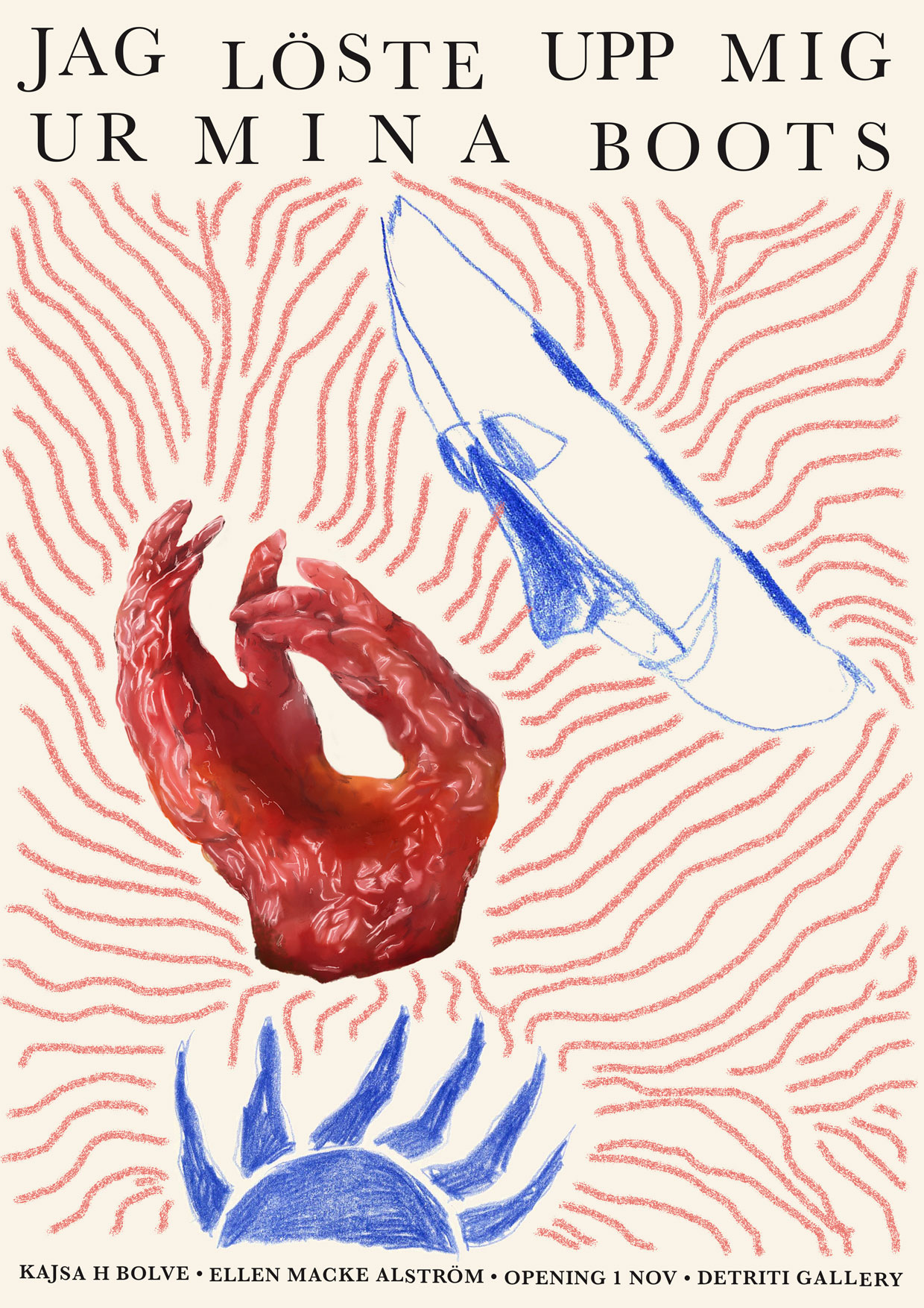 Detriti galleryDetriti har glädjen att presentera "Jag löste upp mig ur mina boots", där konstnärerna Kajsa Håkansson Bolve och Ellen Macke Alström möts i en skulptural dialog formad utifrån idén av en tecknad vikgubbe. Under ett år har de arbetat på verken växelvis, där den ena börjar och den andra tar vid i skapandet tills nya gemensamma hybrida verk tar form. Processen har präglats av video- och fysiska möten, skisser, gemensamma uppgifter och oväntade vändningar.
