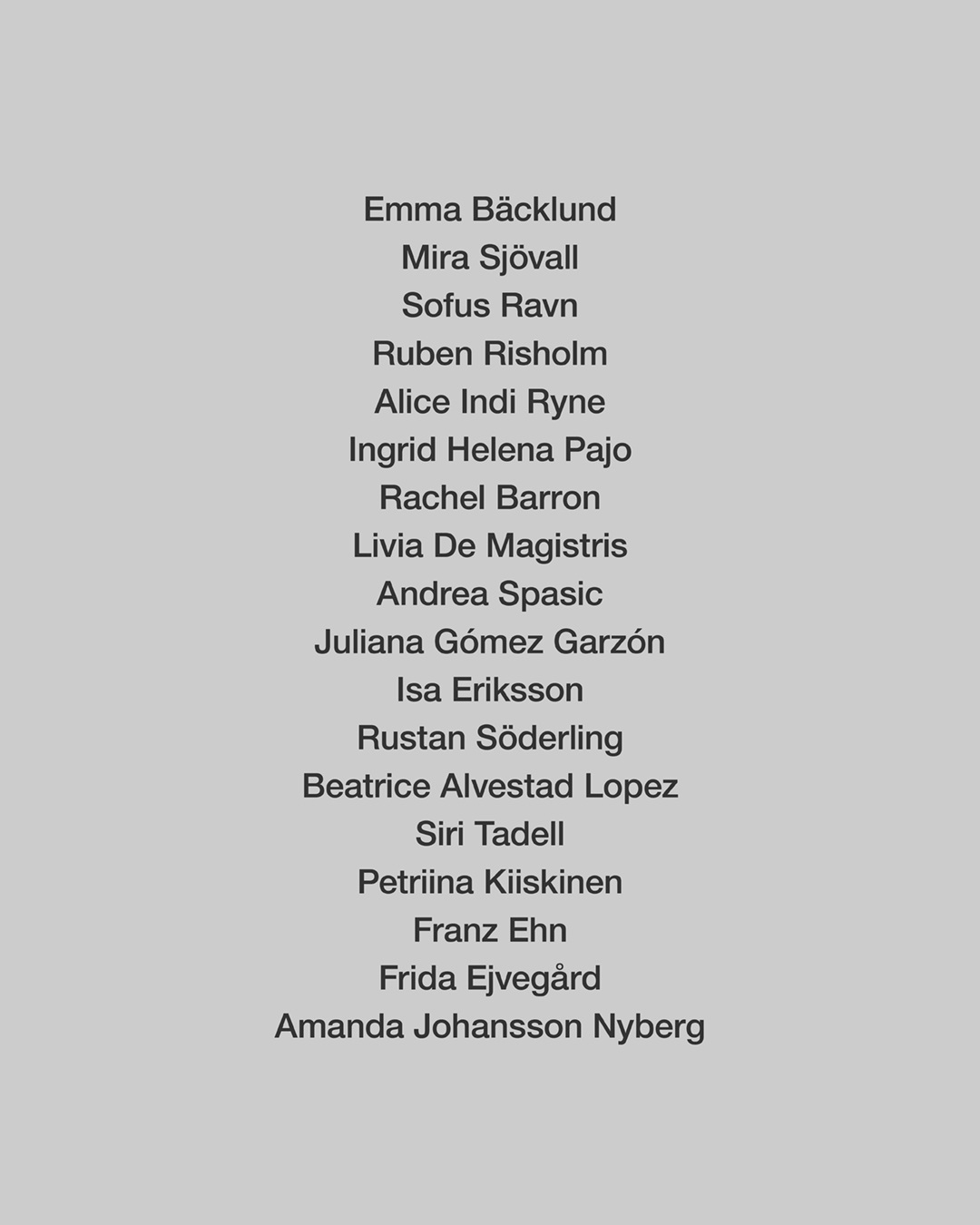 This show features artists Emma Bäcklund, Mira Sjövall, Sofus Ravn, Ruben Risholm, Alice Indi Ryne, Ingrid Helena Pajo, Rachel Barron, Livia De Magistris, Andrea Spasic, Juliana Gómez Garzón, Isa Eriksson, Rustan Söderling, Beatrice Alvestad Lopez, Siri Tadell, Petriina Kiiskinen, Franz Ehn, Frida Ejvegård, Amanda Johansson Nyberg.