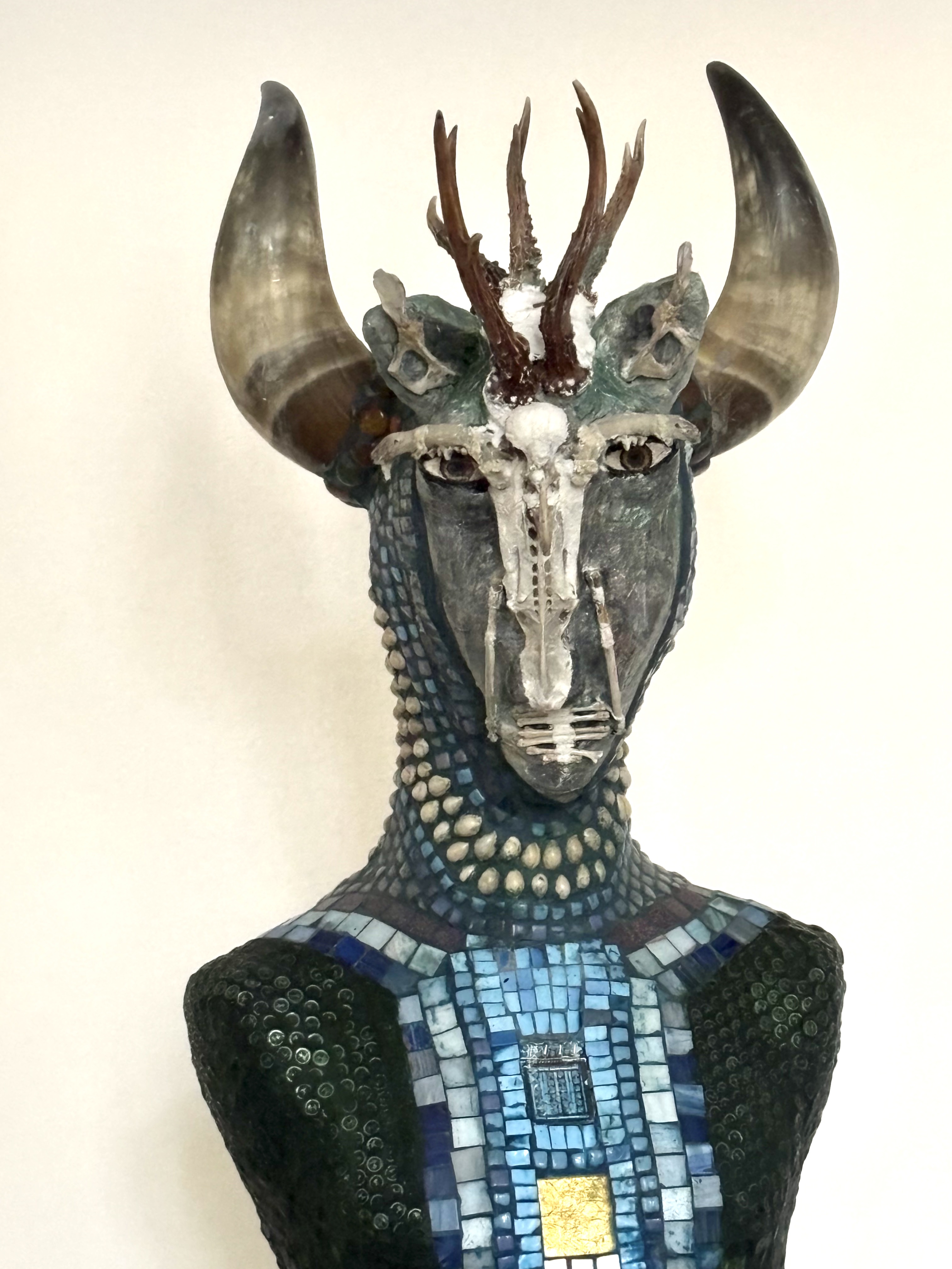 Som en protest mot nöjesjakt och dess trofésamlande började jag göra Masker, gjorde ”nya liv” av gamla jakttroféer. Under arbetets gång har det även vuxit fram stora skulpturer föreställande olika ”varelser och väsen”. I Maskerna och skulpturerna har jag blandat olika djurkranier, benbitar, horn, mosaik, lera och gips. I galleriet iakttar dessa varelser oss, som en tyst och stilla vädjan om eftertanke och respekt för vår natur med dess ”invånare” och som en protest över skövlandet av allas vår skog.